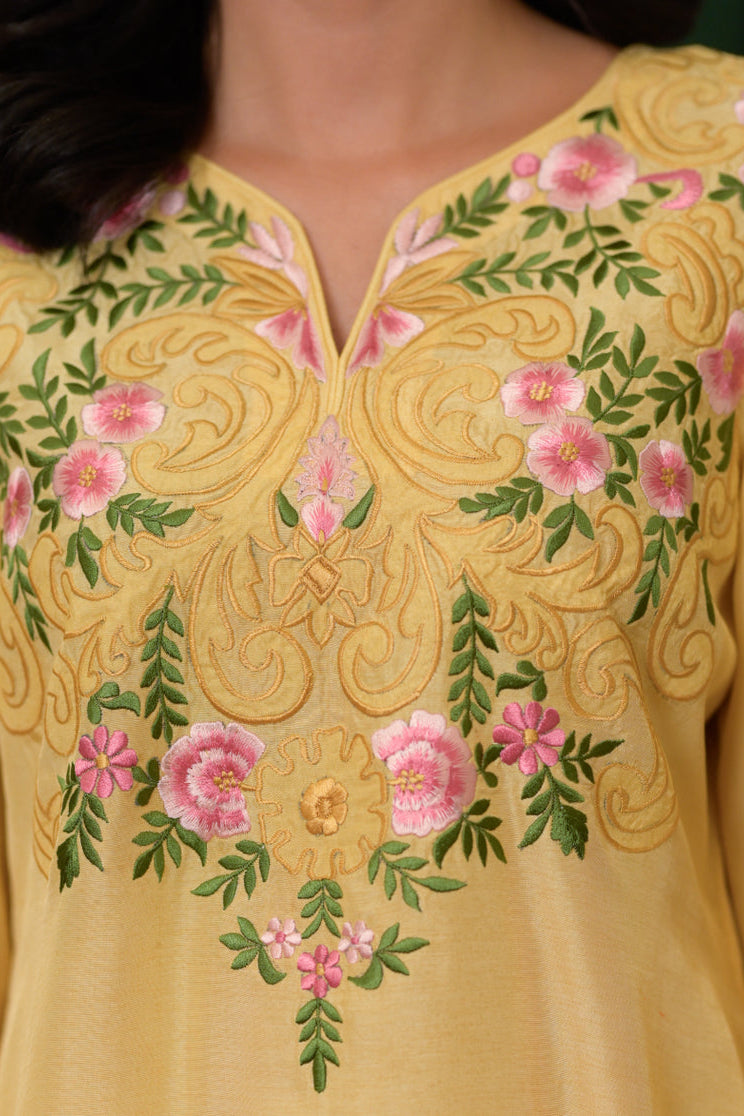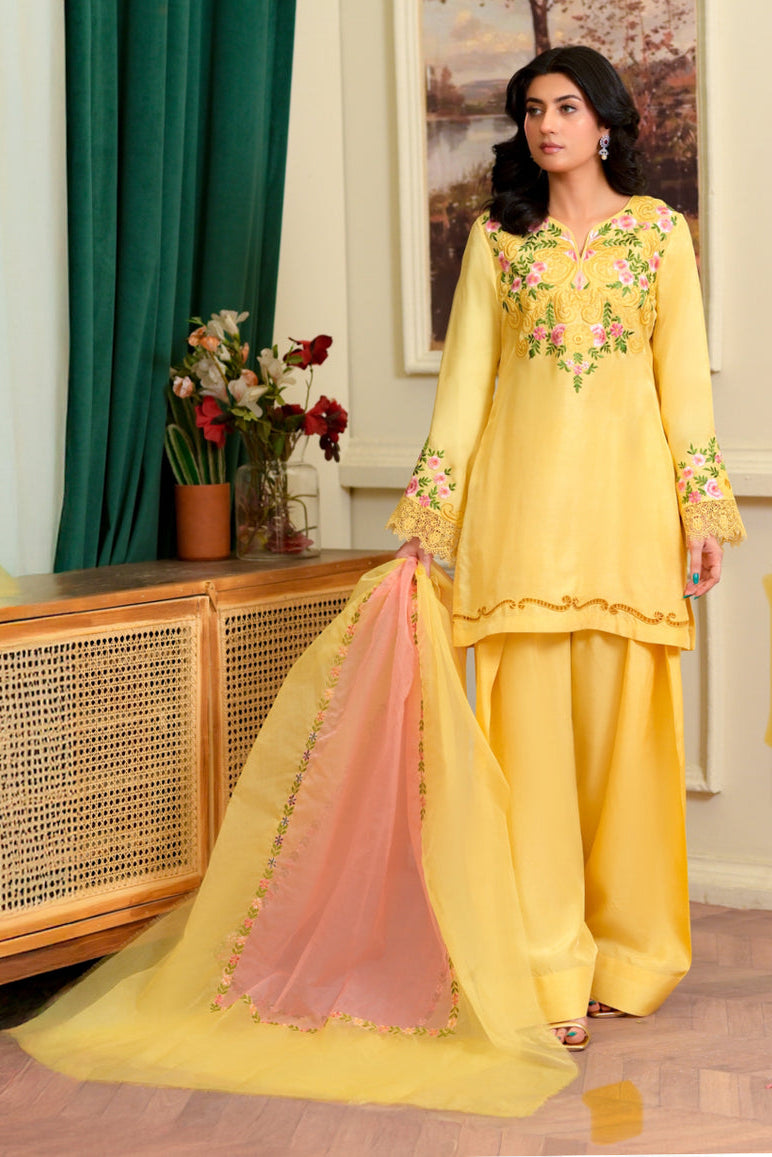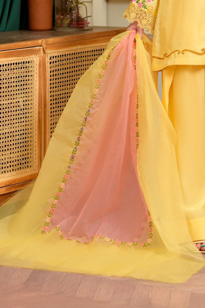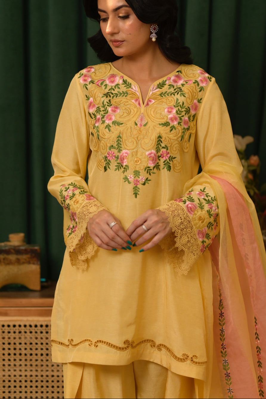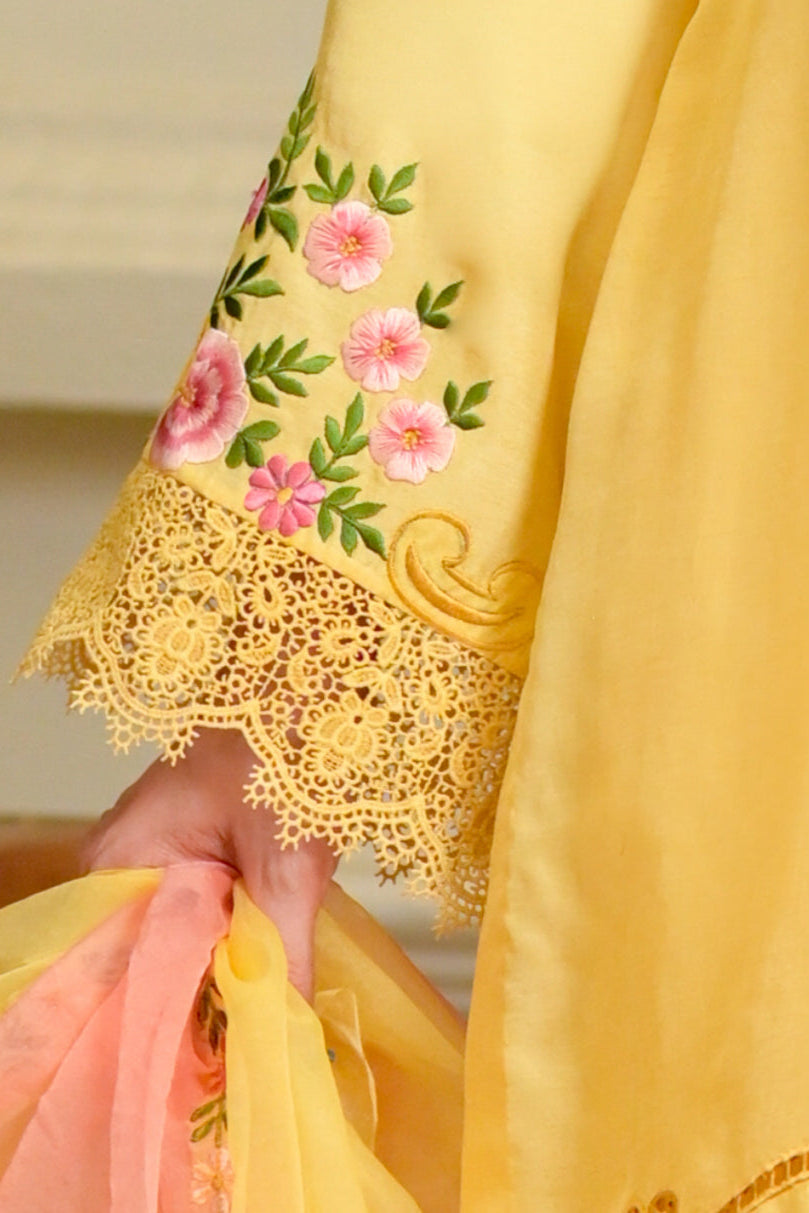 Discover the epitome of elegance with our "Golden Hour Silk Ensemble". This vibrant sunshine-yellow silk suit features delicate pink and green floral embroidery on the neckline and cuffs, exuding springtime charm. Paired with wide-legged trousers and a contrasting blush-edged organza dupatta - the perfect festive look. With intricate hand-embroidered florals, this three-piece ensemble is sure to make you stand out.