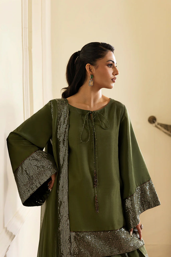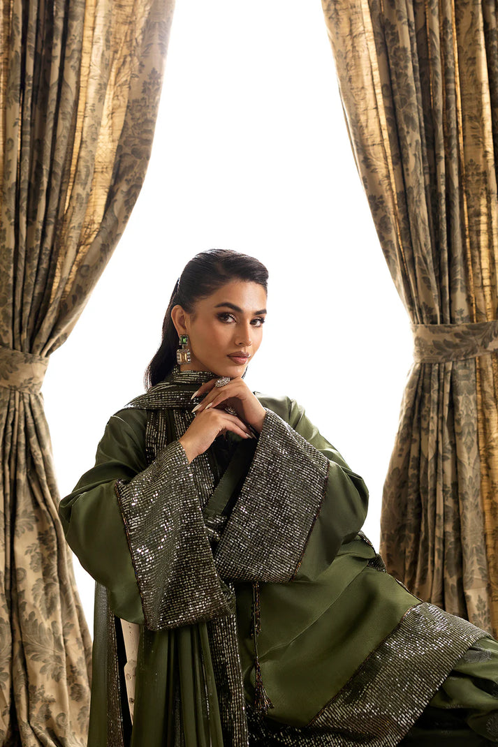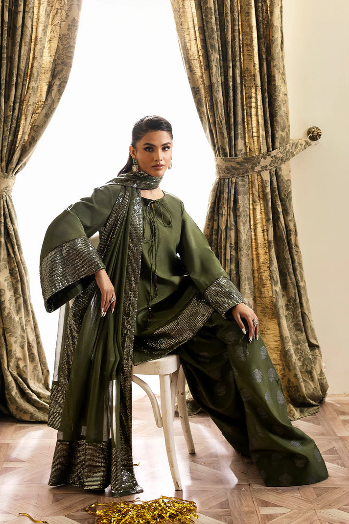 Introducing Olive Gleam, the perfect blend of grace and elegance. Adorned with shimmering sequin borders and a chic modern silhouette, this deep olive green outfit is ideal for festive evenings and timeless celebrations. Made with pure silk, the shirt features sequin embellished sleeves and hem, while the printed wide-leg trousers and sequin-bordered chiffon dupatta add a touch of sophistication. Elevate your style with Olive Gleam.
