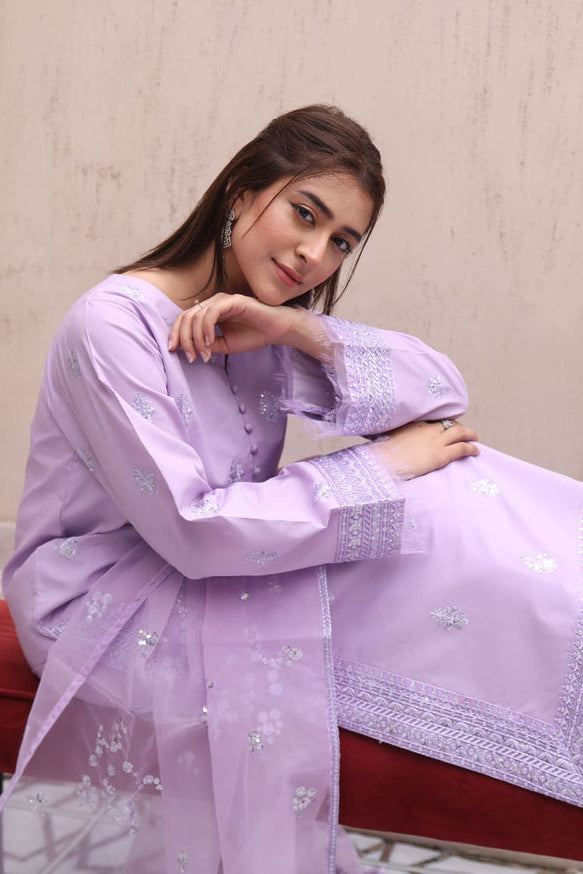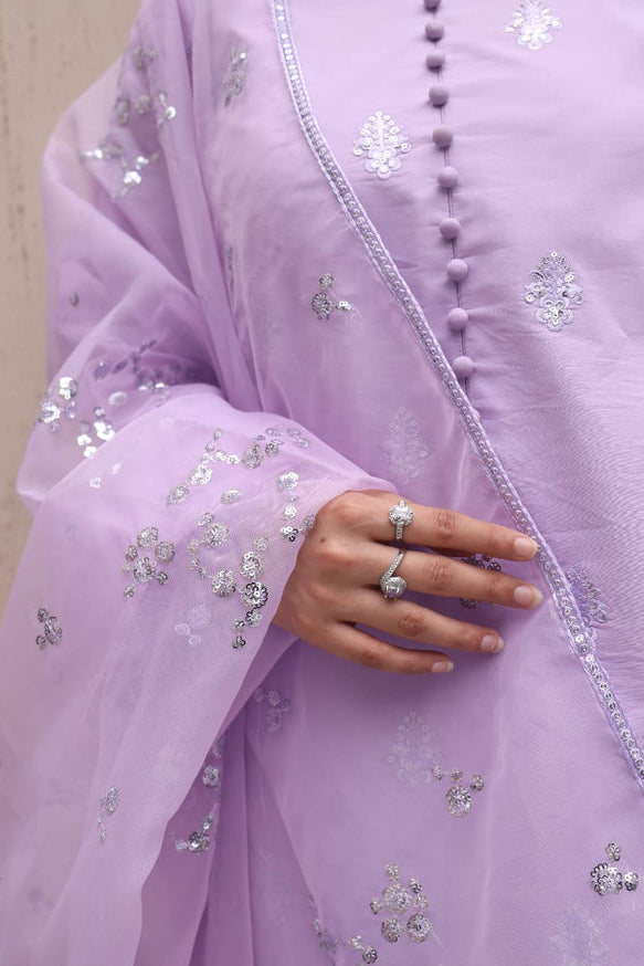 "Add a touch of elegance to your wardrobe with Arzoo. This cotton silk set features delicate silver tilla and sequin embroidery on a charming lavender kurta and trouser. Paired with a sheer organza dupatta and adorned with floral motifs, it's the perfect choice for any daytime event."